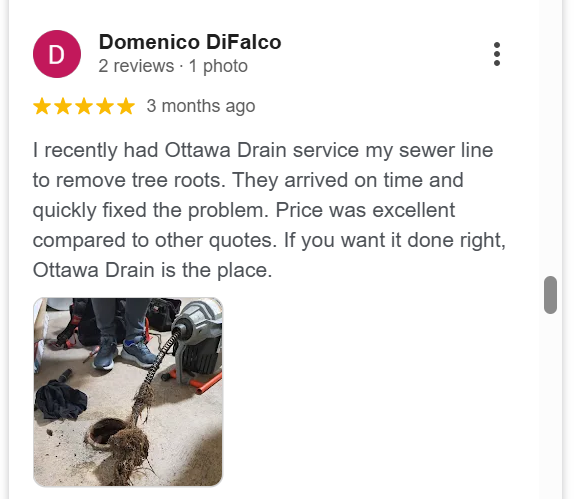 TOP-RATED DRAIN CLEANING IN OTTAWA SERVICES Hydro-JettingLine LocatingDrain SnakingCamera InspectionDrain-AugeringTree Root RemovalEmergency drain cleaningFlooded basement drain responseKitchen drain uncloggingBathtub drain uncloggingShower drain uncloggingSink drain unclogging Floor drain unclogging Basement drain clearing Laundry room drain cleaning Toilet clog removal Urinal drain cleaning Drain pipe flushing and cleaning Grease buildup removal Slow-draining tub or shower solutions Main drain cleaning Storm drain cleaning Restaurant grease trap and drain cleaning WHAT PEOPLE ARE SAYING ABOUT OTTAWA DRAIN CLEANING?
